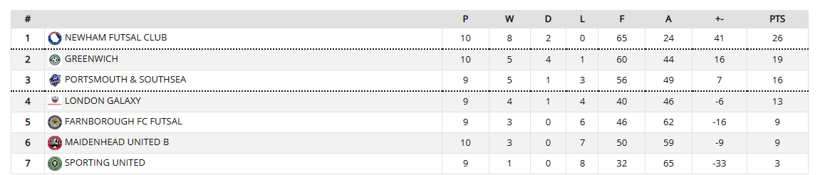 League leaders Newham Futsal Club continue to set the pace, while Greenwich sit just ahead in second. With several crucial fixtures still to come, Portsmouth remain firmly in contention but will need consistent performances to climb higher.